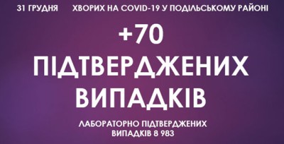 Станом на ранок 31 грудня, у Подільському районі зафіксовано 8 983 підтверджені випадки захворювання на коронавірусну інфекцію, з них 70 за минулу добу.