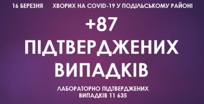 Станом на ранок 16 березня у Подільському районі зафіксовано 11 635 підтверджених випадків захворювання на коронавірусну інфекцію, з них 87 за минулу добу.