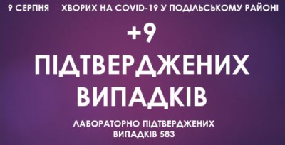 Станом на ранок 9 серпня у Подільському районі зафіксовано 583 підтверджені випадки захворювання на коронавірусну інфекцію, з них 9 за минулу добу.