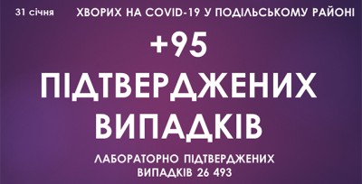 Станом на ранок 31 січня, у Подільському районі зафіксовано 26 493 підтверджені випадки захворювання на коронавірусну інфекцію, з них 95 за минулу добу.