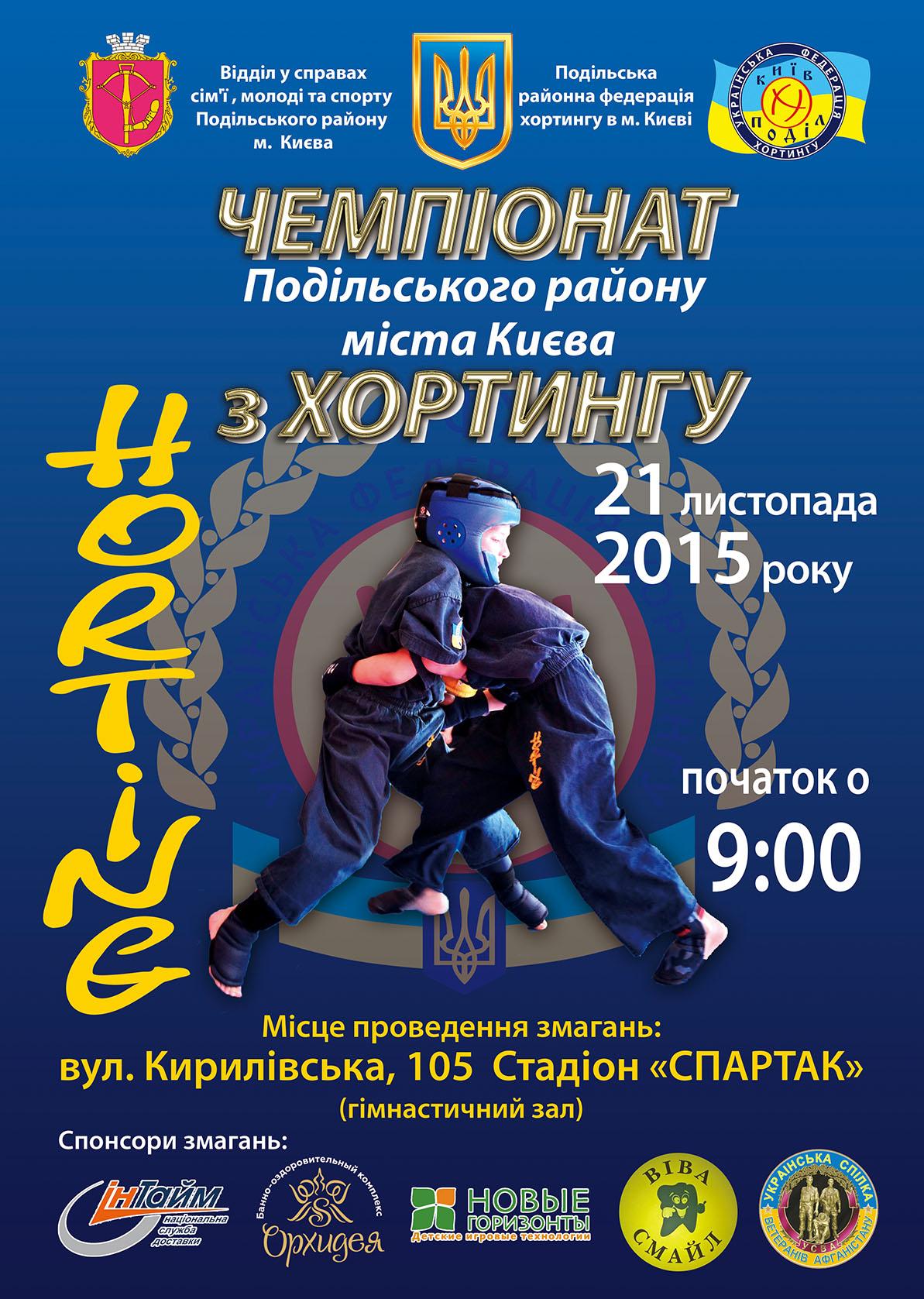 21 листопада відбудеться чемпіонату Подiльського району з хортингу серед молодших юнаків та дівчат 6-7 років, 8-9 років; юнаків та дівчат 10-11 років, 12-13 років; кадетів та кадеток 14–15 років; юніорів та юніорок 16–17 років у розділі «двобій». Чемпіонат приурочений до Дня Гідності та Свободи.