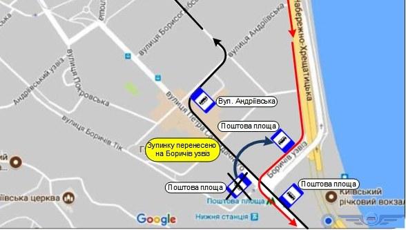 У зв’язку зі зміною траси руху автобусів маршрутів №№62,114 зупинку «Поштова площа» в напрямку Європейської площі перенесено на вулицю Боричів Узвіз ( Боричів Тік).